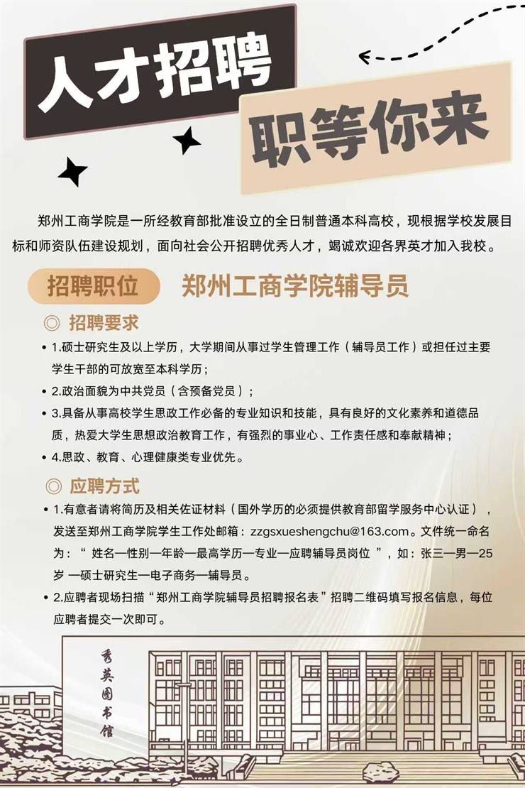 郑州工商学院于11月19日(周三)下午3:00,在河南农业大学龙子湖校区繁塔楼B210室举办人才招聘(辅导员)专场宣讲会,请通知各学院硕士研究生和优秀本科毕业生把握机会,踊跃参加。详情可查看图片和附件。